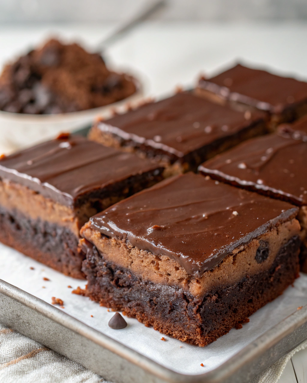 The beauty of this recipe is how each layer plays a different role in the chocolate experience. The base is a chewy brownie that’s dense but tender. Next, a layer of semi-sweet chocolate chips adds melty richness and slight texture. Finally, the ganache blanket on top ties it all together with a smooth, luxurious finish.