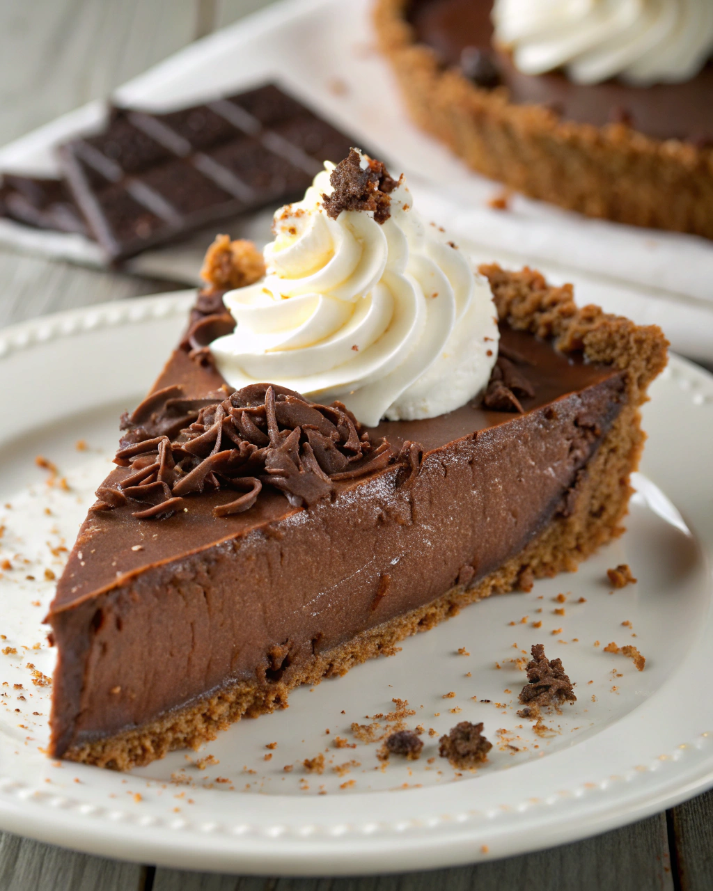 The texture is where this pie really shines. The chocolate filling is thick, creamy, and mousse-like, thanks to a blend of cream cheese and melted chocolate folded with whipped topping. It’s rich but not heavy, sweet but balanced. And it slices cleanly once chilled, making for beautiful presentation.