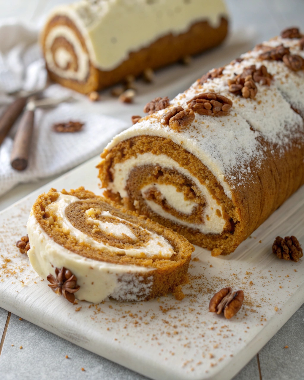 Ultimately, this Pecan Pumpkin Roll Cake represents everything we love about seasonal baking: flavors that remind us of autumn, a presentation that feels special, and a recipe that balances elegance with approachability. Whether you’re making it for a holiday table or a quiet family dessert, it’s sure to become a tradition you’ll look forward to year after year. Its ability to impress without overwhelming makes it a timeless recipe worth keeping in your collection.