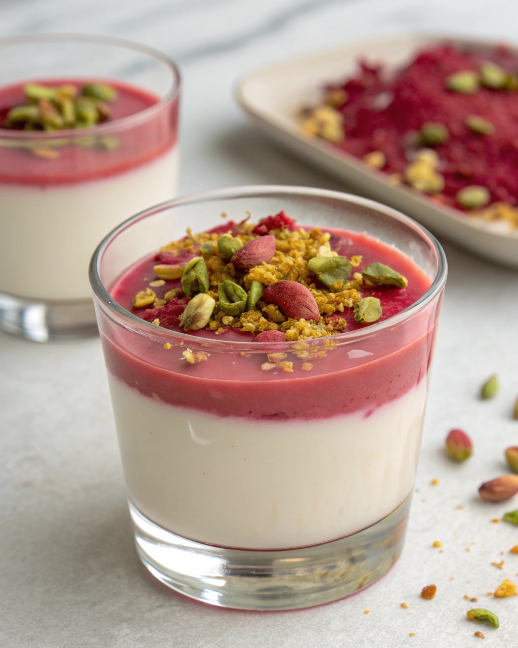 The visual beauty of this pudding cannot be overlooked. Its pale, creamy base topped with a glossy pink layer and finished with golden-green pistachios looks elegant enough for special occasions yet simple enough for everyday enjoyment.